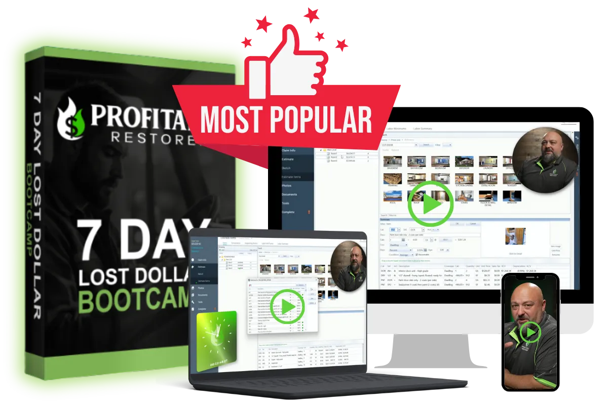 7-Day Lost Dollar Bootcamp: Need quick cash? This course covers the biggest leaks in water damage, fire, contents, and rebuild, helping you recoup lost dollars from existing jobs.